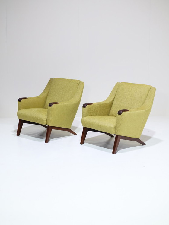 *Due disponibili, prezzo unitario* Splendida poltrona vintage danese degli anni '60. Questa poltrona è elegantemente progettata con splendidi dettagli in legno sui braccioli e una silhouette unica grazie alla combinazione di linee organiche e geometriche nelle gambe e nella struttura. Ricorda i disegni di Johannes Andersen.