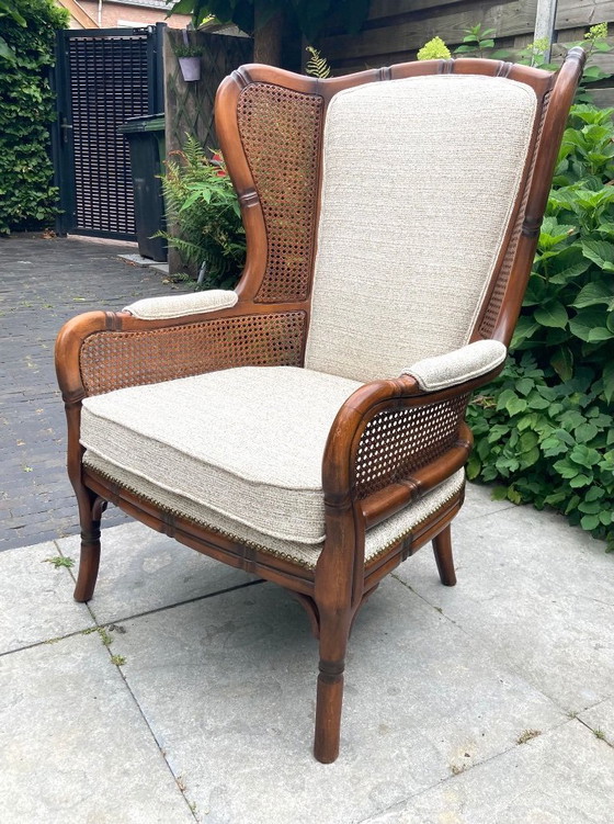 Poltrona vintage Giorgetti Wingback anni '70 - finto bambù. Completamente rivestita professionalmente e come nuova. Nessuna macchia nel tessuto e fettuccia intatta. Il legno presenta alcuni leggeri segni d'uso ma è in buone condizioni.