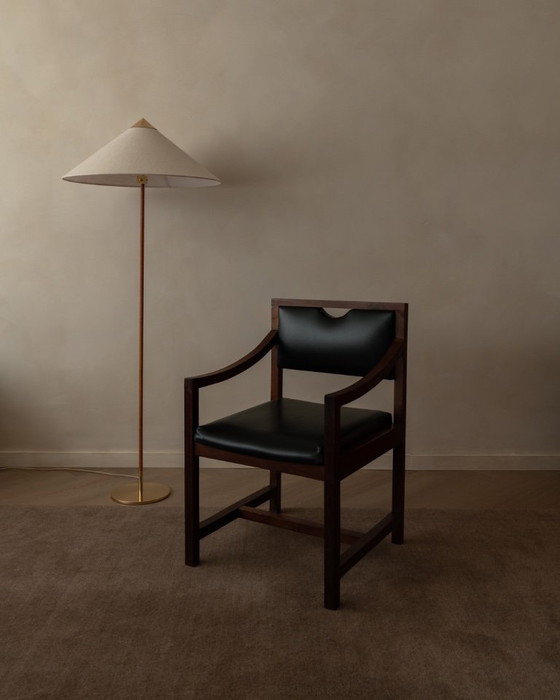La sedia ha una struttura in legno massello con una calda tinta scura e rivestimento in similpelle nera su seduta e schienale. Le proporzioni sono splendidamente equilibrate: linee grafiche e squadrate con braccioli delicatamente curvi e raffinati incastri a vista su braccioli e schienale. Un bell'esempio di artigianato di metà secolo.