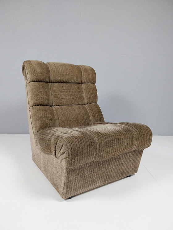Una comoda poltrona reclinabile vintage degli anni '70 con un bellissimo look retrò. La poltrona è rivestita in morbido tessuto a coste in un caldo colore beige/tortora, che si abbina perfettamente allo stile dell'epoca. La poltrona presenta una seduta e uno schienale spessi e comodi con pannelli cuciti, che la rendono non solo elegante ma anche molto comoda. Grazie al suo profilo basso e all'ampia seduta, è la poltrona ideale per rilassarsi. Perfetta come poltrona in soggiorno, in un angolo lettura o come elemento vintage di carattere in un interno moderno. La poltrona poggia saldamente su gambe basse ed è in buone condizioni vintage, con lievi segni di usura commisurati alla sua età. Una splendida poltrona per gli amanti del design anni '70 e degli interni retrò.
