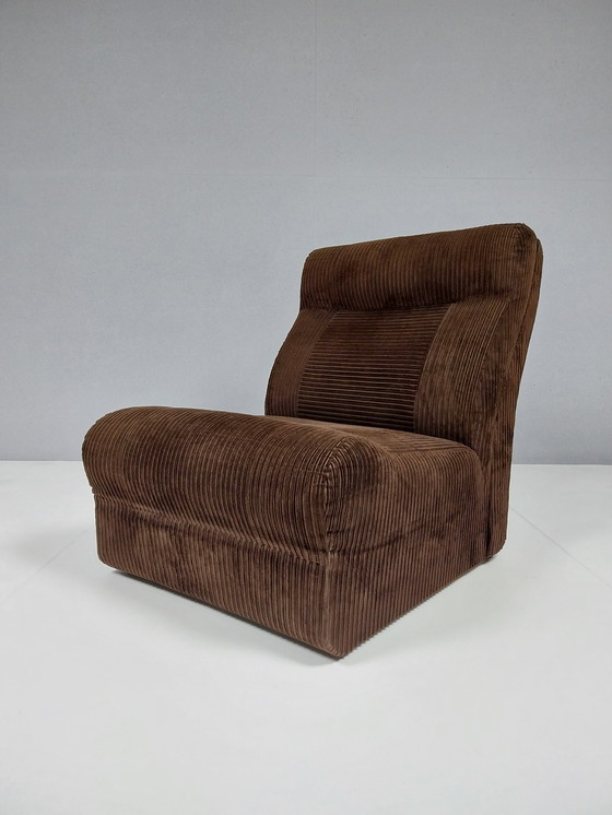 Comoda poltrona vintage anni '70 in tessuto a coste marrone con un look decisamente retrò. La sedia ha un design basso e robusto con curve morbide e una seduta profonda, tipico del design degli anni '70 e ideale per un'esperienza lounge rilassata. Grazie al suo design modulare, questa poltrona può essere utilizzata singolarmente o combinata con altri elementi della stessa serie. La seduta e lo schienale sono generosamente e comodamente imbottiti. La poltrona è adatta per l'uso in soggiorno, zona lounge, camera da letto o studio.