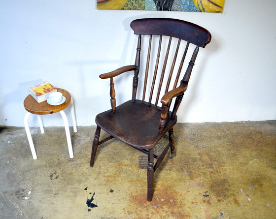 Questo è un antico tesoro inglese in stile vittoriano. La sedia Windsor, in stile Thames Valley, è realizzata in legno di olmo e frassino e risale al XIX secolo. La sedia era realizzata appositamente per le signore. La sedia Windsor è caratterizzata dai braccioli alti e verticali. La seduta tra i braccioli è relativamente stretta e adatta solo a persone con una vita sottile.