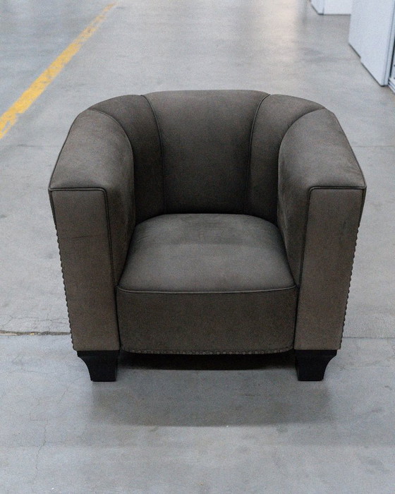 Elegante poltrona di design di Wittmann, ispirata all'Art Nouveau viennese. Rivestita in lussuosa pelle nabuk grigio fumo con finitura scamosciata. Finiture di alta qualità ed eccellente comfort di seduta.