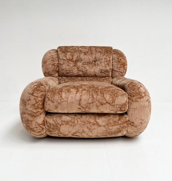 Questa poltrona italiana degli anni '70 è un pezzo unico. Questa robusta poltrona è rivestita in un caldo e spesso velluto color ruggine. Questa poltrona "nuvolata" è molto comoda e una gioia per gli occhi! Presenta lievi segni di usura coerenti con la sua età.