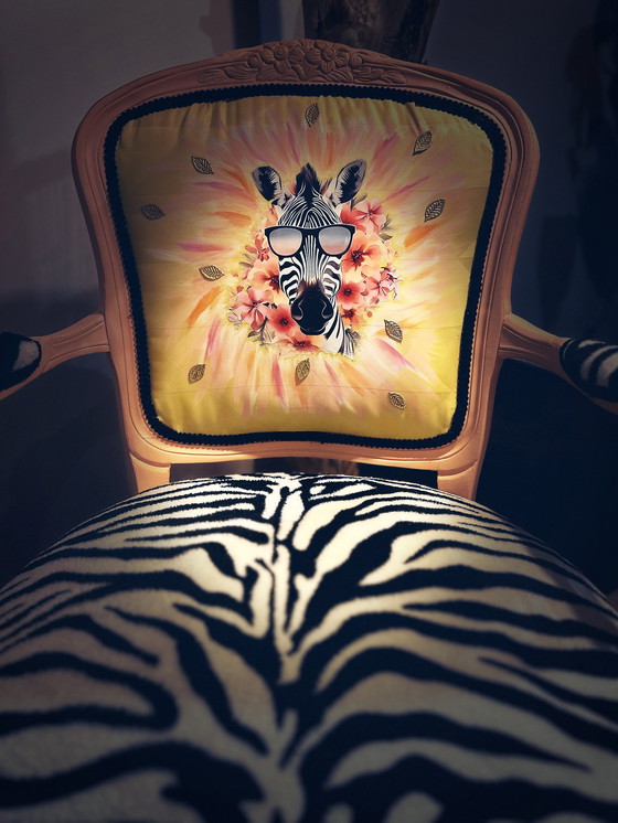 Porta il divertimento nel tuo salotto! 😎 Questa poltrona unica attirerà sicuramente l'attenzione e regalerà sorrisi: struttura in legno colorata, seduta morbida, elegante stampa zebrata e piccoli dettagli artistici che fanno la differenza.