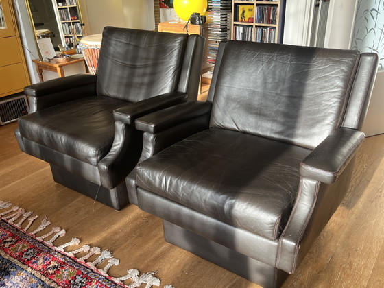 Coppia di poltrone in stile Mid-Century Modern in pregiata pelle marrone. Queste poltrone offrono un design senza tempo e una seduta comoda e avvolgente. Perfette per aggiungere un tocco di eleganza vintage a qualsiasi spazio abitativo.