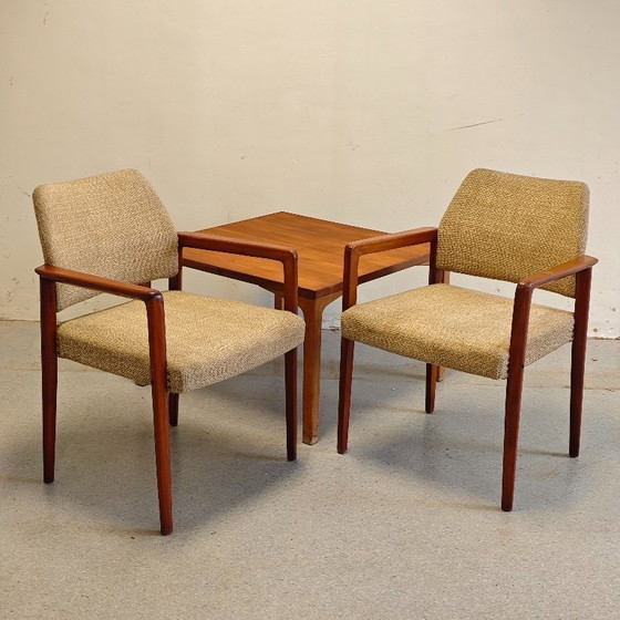 Questo splendido set è ancora in buone condizioni vintage. Il grazioso tessuto beige è stato pulito e appare ancora in ordine. Le strutture delle sedie hanno ricevuto una nuova mano di olio e ora sono anch'esse in buone condizioni. Il tavolo è stato carteggiato e verniciato e mostra ancora lievi segni di usura qua e là. Un set meraviglioso!