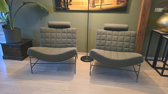 Poltrone Leolux Volare, disegnate da Jan Armgardt, in un caldo colore verde. Le poltrone sono rivestite in tessuto Ploeg Randers 24/59 e dotate di poggiatesta. È disponibile un ulteriore rivestimento in tessuto (circa 230 x 150 cm), ad esempio per rivestire un pouf o un pouf. Le poltrone sono state poco utilizzate e sono in buone condizioni.