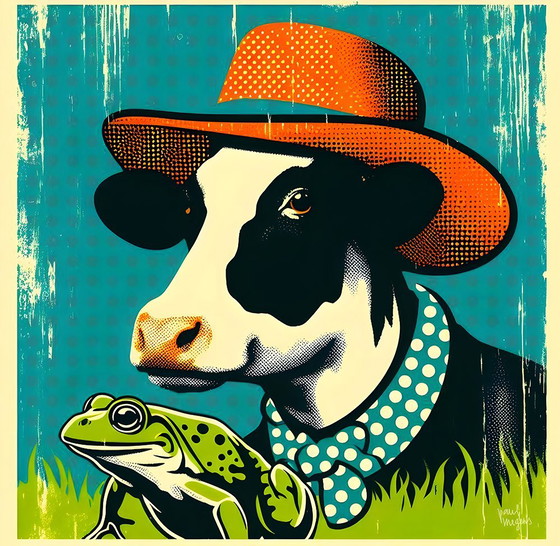Nuova stampa pop art su splendida tela. "La mucca e la rana", 80 x 80 cm. Non montata.