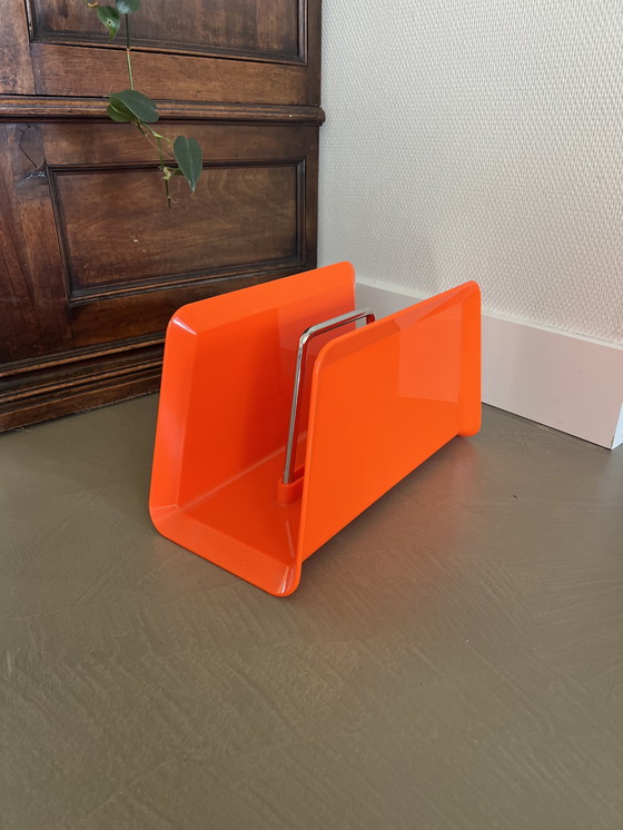 Questo portariviste retrò di Studio Domo, progettato da Speziell, è un'aggiunta sorprendente e funzionale a qualsiasi arredamento. Realizzato in robusta plastica arancione con dettagli in metallo, offre un modo elegante per tenere in ordine riviste e giornali. Il design retrò aggiunge un tocco di nostalgia, mentre i colori vivaci creano un look vivace. Perfetto sia per interni moderni che classici.