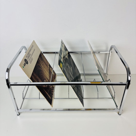 Porta LP/dischi vintage in metallo cromato, progettato per esporre e conservare i vinili in posizione verticale.