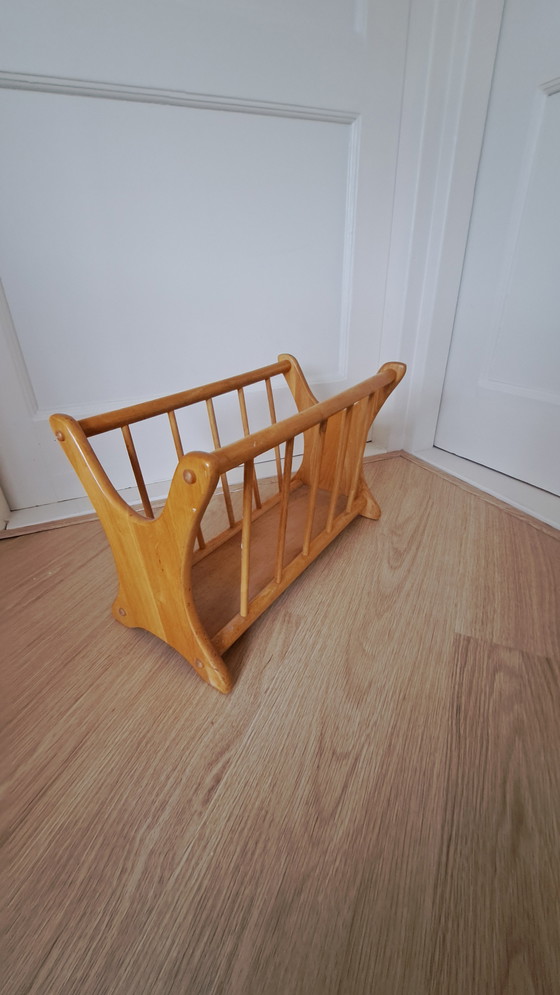 Questo splendido portariviste vintage in legno è un'elegante aggiunta a qualsiasi arredamento. Con la sua calda tonalità marrone e il design classico, offre un modo elegante per organizzare riviste e giornali.
