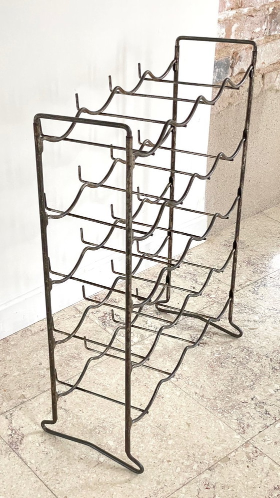 Bellissimo portabottiglie vintage in acciaio, un accessorio portaoggetti degli anni '40-'50 e un vero pezzo decorativo. Grafico e geometrico, perfetto per un piano di lavoro o una mensola della cucina... una piccola cantinetta per conservare bottiglie, bottiglie di latte, succo d'arancia, aceto... ne siamo grandi fan! In ottime condizioni, l'acciaio ha una bella patina, le tacche sul retro trattengono saldamente le bottiglie e può contenere fino a 20 bottiglie. Completamente smontabile.