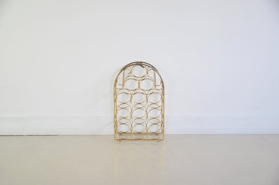 Un portabottiglie vintage in metallo dorato. Il portabottiglie presenta una patina.