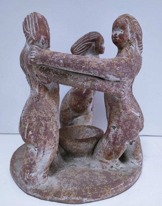 Candeliere centrotavola in ceramica con patina terracotta. Realizzato negli anni '90. Il candeliere raffigura un cerchio di donne. In buone condizioni generali. Notevole patina. Altezza totale 21,5 cm. Diametro totale della base 20 cm. La candela profumata mostrata nelle foto non è inclusa.