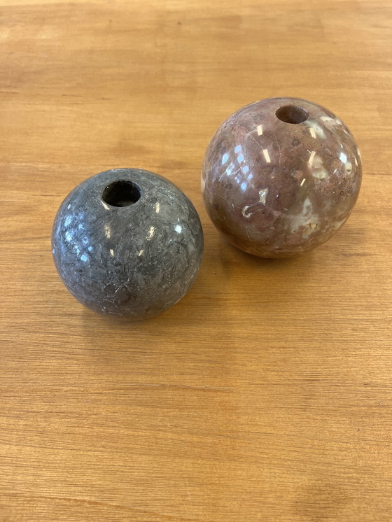 Candeliere DD Sphere grande e piccolo. Questo candeliere è stato disegnato da Edin Lina Kjellvertz per Dusty Deco. Il candeliere è rotondo e realizzato interamente in marmo. Il peso del marmo aggiunge profondità, nonostante le dimensioni più piccole. Poiché il marmo è un materiale naturale, sfumature e motivi possono variare, aggiungendo unicità a ogni candeliere. Il candeliere DD Sphere grande è alto 12 cm, mentre quello più piccolo è alto 10 cm. Utilizzato per un progetto di styling.