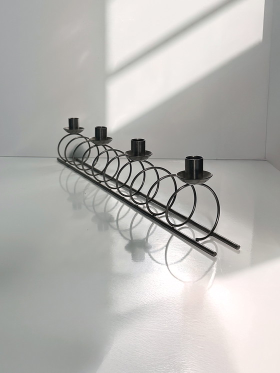 Bellissimo grande candelabro di fine anni '80/inizio anni '90. Design postmoderno in stile Memphis, realizzato in metallo nero. Per quattro candele. Altezza 12 cm, dimensioni 8 x 60 cm. Minimi segni di usura.