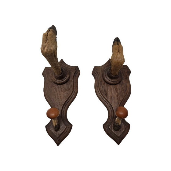 Antichi porta fucili francesi fatti di gambe, della metà del XX secolo. Questo tipo di oggetti veniva e viene tuttora utilizzato per tenere il fucile da caccia. Le zampe sono di capriolo e sotto un pezzo di corno con pomello di legno, montato su uno scudo di quercia.