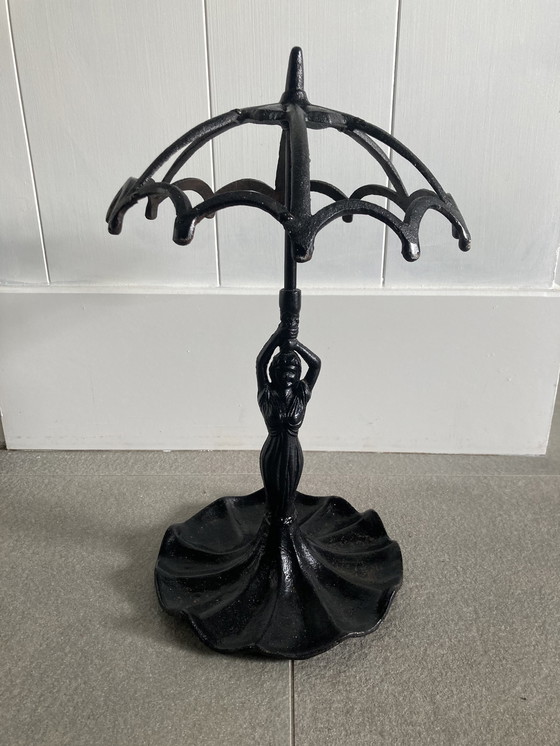 L'elegante figura femminile e l'elaborata sommità a forma di ombrello si sposano bene con il periodo Art Nouveau (o Jugendstil), noto per le sue linee fluide e le forme naturali. Funge da supporto decorativo e funzionale per riporre ombrelli e bastoni da passeggio.