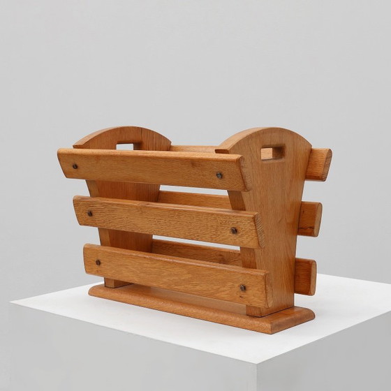 Bellissimo portagiornali o portariviste vintage. Realizzato in Francia negli anni '60 in rovere massiccio. Questo portariviste è dotato di quattro robusti listelli di legno arrotondati su ogni lato, e la parte anteriore e posteriore sono dotate di pratiche maniglie.