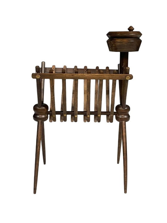 Un elegante portariviste vintage in faggio, realizzato in Francia negli anni '60. Realizzato in faggio marrone con raffinati dettagli in ottone, questo pezzo è allo stesso tempo pratico e decorativo. Un raffinato esempio di design francese di metà secolo, ideale per soggiorni, uffici o interni di ispirazione retrò. Ottime condizioni, con solo lievi tracce di usura coerenti con l'età.