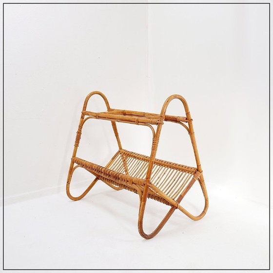 Questo portariviste vintage in rattan degli anni '60, prodotto nei Paesi Bassi, è un'aggiunta affascinante a qualsiasi arredamento. La sua struttura in rattan naturale offre un autentico look retrò, ideale per gli amanti del design d'epoca. Compatto e funzionale, permette di riporre le riviste con stile, aggiungendo un tocco di calore al vostro spazio.