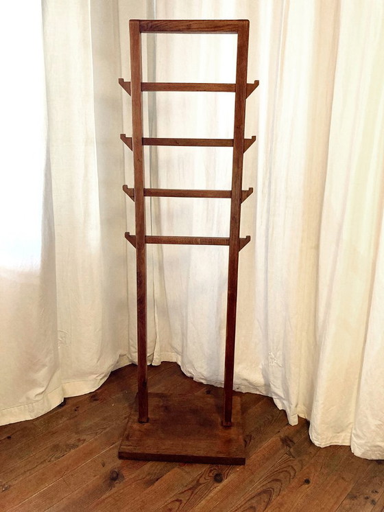 Un raro modello verticale con barre laterali e otto ganci laterali, il tutto in rovere massello. È montato su una base spessa 3,5 cm.