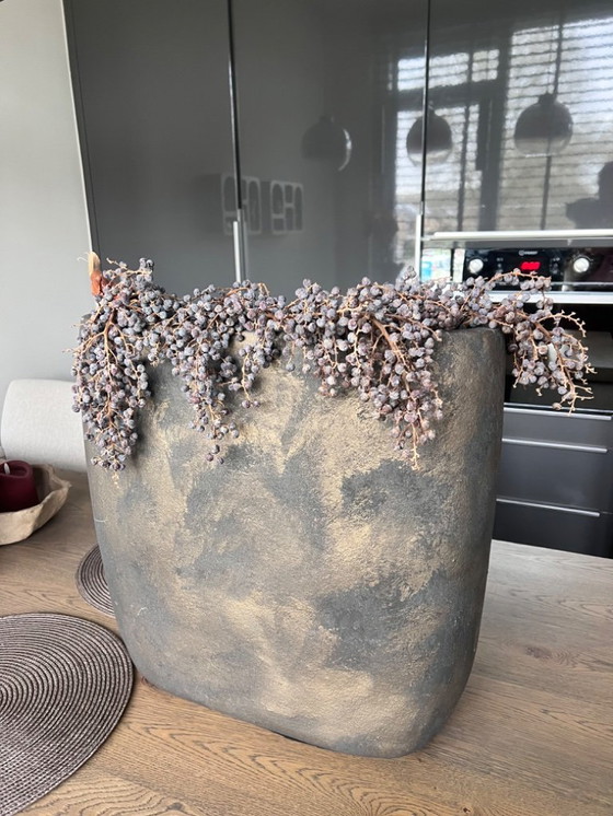 Bellissimo vaso di Intratuin. Il prezzo originale era di 79,99 €. Grigio con macchie dorate. Alto 45 cm e largo 45 cm. Se lo desiderate, potete avere anche il ramo di dattero essiccato. Ancora praticamente nuovo.