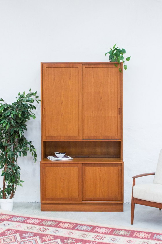 Una bellissima credenza che rende ogni stanza un po' più accogliente con la sua forma chiara e la calda tonalità del legno. È stato prodotto con la massima qualità da Hundevad in Danimarca. Il bellissimo legno di teak ha venature vivaci e calde e rende il mobile un vero e proprio richiamo visivo nella vostra casa. Dietro le ante scorrevoli si trova un ampio spazio per riporre ogni tipo di oggetto. L'altezza dei ripiani può essere regolata in modo da poterli personalizzare in base alle proprie esigenze. Le maniglie incassate si integrano armoniosamente nel design. Lo zoccolo conferisce al mobile una solida base e stabilità. Presenta lievi segni d'uso e scolorimento dovuti all'età.