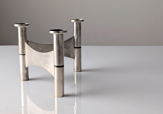Questo candelabro scultoreo e modernista, attribuito al designer francese Roger Tallon per Ravinet d'Enfert, è un pezzo di design notevole. La sua provenienza è specifica: l'oggetto reca l'incisione distintiva "C. N. G. T. 1ER PRIX VINCENNES 1978", che ne conferma il ruolo di Primo Premio del Circuit National des Grands Tournois (CNGT), il principale circuito tennistico nazionale francese, assegnato a Vincennes nel 1978. Questa storia unica è parte integrante dell'oggetto. Fa parte della sofisticata linea disegnata da Tallon per Ravinet d'Enfert negli anni '70. La struttura è composta da tre robusti supporti cilindrici poggianti su basi circolari. Questi sono collegati da un elemento centrale curvo in metallo argentato che crea una silhouette dinamica e architettonica. Il metallo argentato presenta una patina autentica, coerente con la sua epoca, che ne esalta le linee nette ed eleganti. Le tre sezioni cilindriche sono progettate per contenere candele. La sua struttura robusta e la precisa lavorazione dei metalli si allineano all'estetica di fine Mid-Century, enfatizzando la semplicità geometrica e la qualità dei materiali. La superficie presenta lievi segni e segni di usura originali, mantenendo il suo autentico carattere vintage.