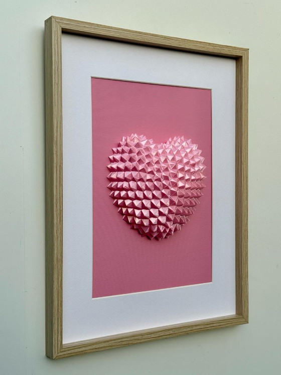 La superficie netta e strutturata contrasta con la delicatezza delle sue tonalità rosa, creando un equilibrio tra vulnerabilità e controllo. Montato su una tela dipinta a mano con spray acrilico, lo sfondo accentua il senso di profondità pur mantenendo un'estetica pulita e minimalista.
