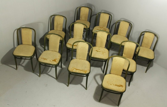 12 sedie verdi in legno curvato in perfette condizioni. Le strutture delle sedie sono in ottime condizioni. Diverse sedie presentano lievi difetti nel legno, vedi foto. Il rivestimento è molto usurato.