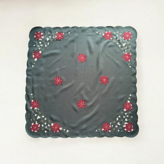 Quadratische Vintage Weihnachts-Tischdecke – Grün mit roten Weihnachtsblüten, ca. 87x87 cm