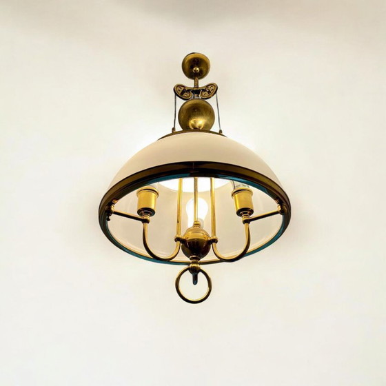 L'ottone è leggermente appannato solo in alcuni punti e il paralume in vetro è intatto. Nel complesso, il lampadario a sospensione è in condizioni eccezionalmente buone per la sua età.