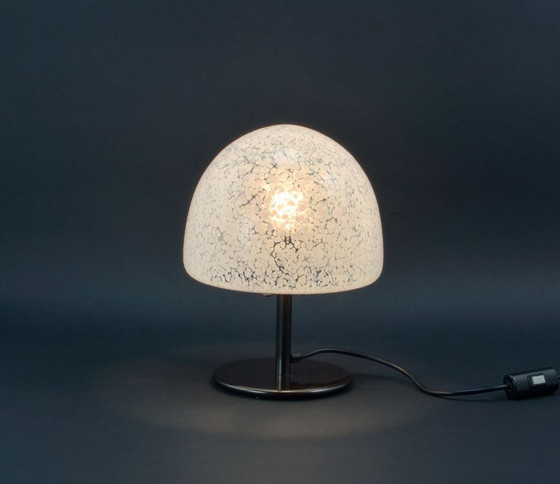 Rara lampada da tavolo a forma di fungo con vetro di Murano maculato attribuita a Barovier e Toso, Italia, anni '60. Vetro sovrapposto a forma di fungo, trasparente e bianco maculato. Base in metallo. Prodotta da Barovier & Toso, Italia, anni '50. Barovier & Toso è una delle più antiche e prestigiose vetrerie di Murano, rinomata per la sua eccezionale maestria artigianale e innovazione. Questa piccola ma raffinata lampada emette una luce calda e diffusa ed è in ottime condizioni vintage. Dimensioni: altezza totale 31, diametro 22 cm.