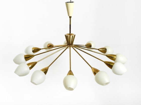Rarissimo splendido lampadario a 12 bracci in ottone del Mid Century con paralumi in vetro opalino