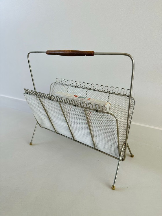 Questo portariviste ha linee minimaliste e pulite tipiche del design degli anni Cinquanta e Sessanta. La combinazione tra la struttura in metallo cromato lucido e l'esclusiva rete metallica bianca e la calda maniglia in legno crea un look autentico e chic.