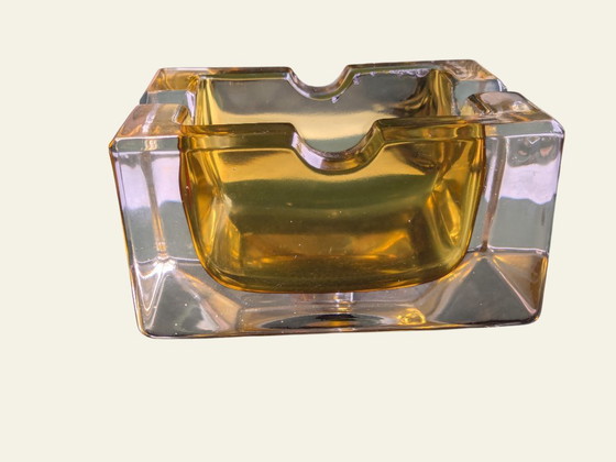 Un elegante posacenere della metà del secolo scorso, un vero e proprio pezzo forte per gli amanti del design e i collezionisti. Il posacenere è realizzato in vetro giallo massiccio ed è presentato in un'elegante custodia in pelle rossa che si abbina perfettamente al suo design elegante.