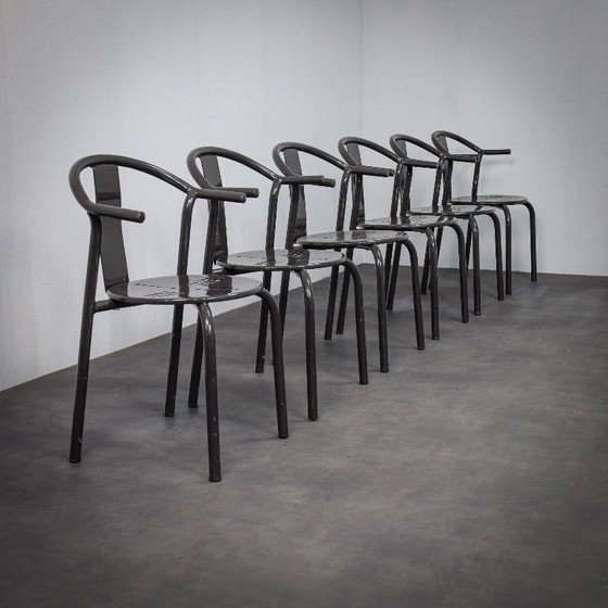 Raro set di sei sedie da pranzo "Maxmo" prodotte da IKEA negli anni '80, che rappresentano un capitolo audace e giocoso del design postmoderno. Queste sedie incarnano un linguaggio grafico distintivo, dove linee tubolari curve e sedute in metallo perforato si fondono in una forma scultorea ma funzionale.