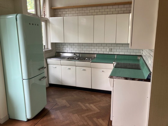 Cucina americana vintage completa degli anni '60 del designer Raymond Loewy. La cucina presenta diversi elettrodomestici da incasso: