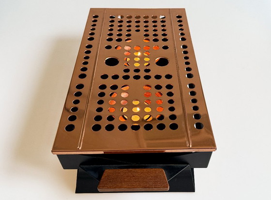 - Realizzato in lamiera d'acciaio, rame e teak di alta qualità, questo rechaud offre resistenza e un aspetto esteticamente gradevole.