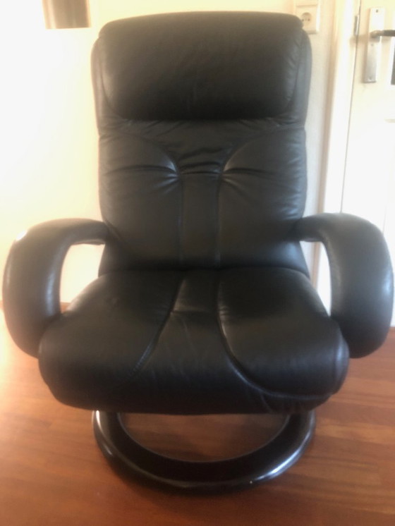 Questa poltrona ergonomica in pelle nera del marchio Elastoform, acquistata nel 2008 presso Bakker Meubelen a Veendam, è ancora bellissima. È stata utilizzata in una famiglia senza figli. Lo schienale e il cuscino sono regolabili (separatamente) e la poltrona ha un supporto per le gambe pieghevole. Il piede ad anello in legno laccato nero presenta un leggero danno che è facile da rimuovere.