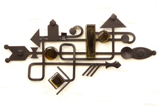 Decorazione da parete in ferro saldato laccato nero con elementi in vetro colorato.