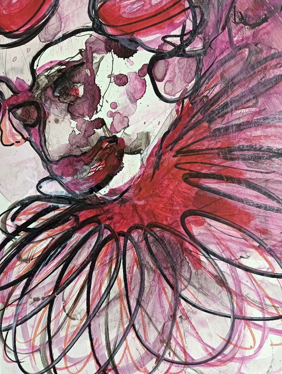 Scopri il mondo espressivo di Rob Jacobs con questo esclusivo dipinto incorniciato, intitolato "Vuoi un palloncino?". Creata nel 2017, quest'opera combina pittura acrilica, matita, pennarello e pastello su cartoncino, irradiando un'energia vibrante che darà vita a qualsiasi spazio.