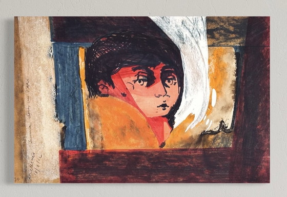 Quest'opera di Robert Detheux, intitolata "Femme dans un taxi", datata 18 settembre 1962, misura 41,5 cm x 27 cm. Raffigura una donna in una cornice che evoca l'interno di un taxi. I colori vivaci e i contrasti netti creano un'atmosfera dinamica. I tratti espressivi e i giochi di luce aggiungono profondità narrativa, catturando un momento di riflessione o di viaggio. Quest'opera illustra lo stile unico di Detheux, che combina realismo e astrazione con un tocco poetico.