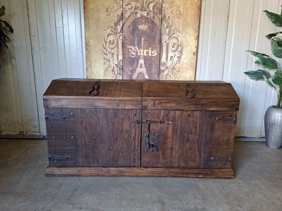 Robusto baule contenitore con cassetti e portabottiglie con serratura e chiave. Dimensioni: 140x56 cm e 73 cm di altezza.