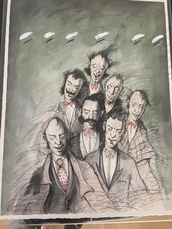 Questa accattivante opera d'arte di Roland Rens, datata 1992, presenta una vivida rappresentazione espressionista di sette figure, ciascuna caratterizzata da tratti e abiti distintivi. L'opera è resa con un uso dinamico di colore e linee, catturando un senso di movimento ed emozione. Lo sfondo verde contrasta magnificamente con i dettagli rossi e neri, creando un impatto visivo sorprendente. Quest'opera sarebbe un'aggiunta di pregio a qualsiasi collezione, offrendo uno scorcio sul mondo immaginario dell'artista.