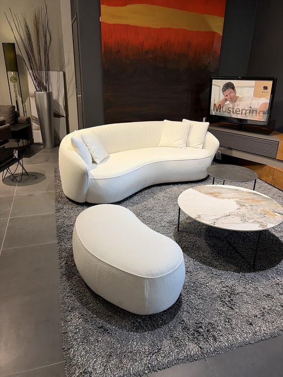 Con questo divano rotondo di Musterring, completo di poggiapiedi, aggiungerai un tocco di raffinatezza al tuo soggiorno, coniugando eleganza e comfort. Il suo design moderno, caratterizzato da linee morbide e una finitura in tessuto bianco immacolato, lo rende un elemento centrale di grande impatto per qualsiasi interno contemporaneo.