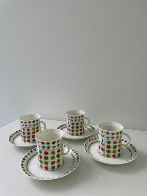 Set di quattro tazze e piattini vintage Rosenthal, realizzati in porcellana bianca con il colorato motivo floreale Piemonte. Disegnati da Hans-Theo Baumann, i decori sono di Emilio Pucci. Questo espressivo motivo è stato prodotto tra il 1965 e il 1979 ed è uno splendido esempio di design di metà secolo.