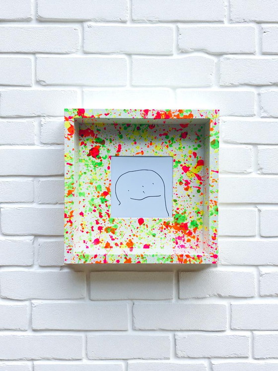 Disegnato con uno smiley minimalista che cattura l'espressione di una persona, di un animale o di un momento, abbinato a una cornice schizzata con colori acrilici al neon dallo stesso Rover.